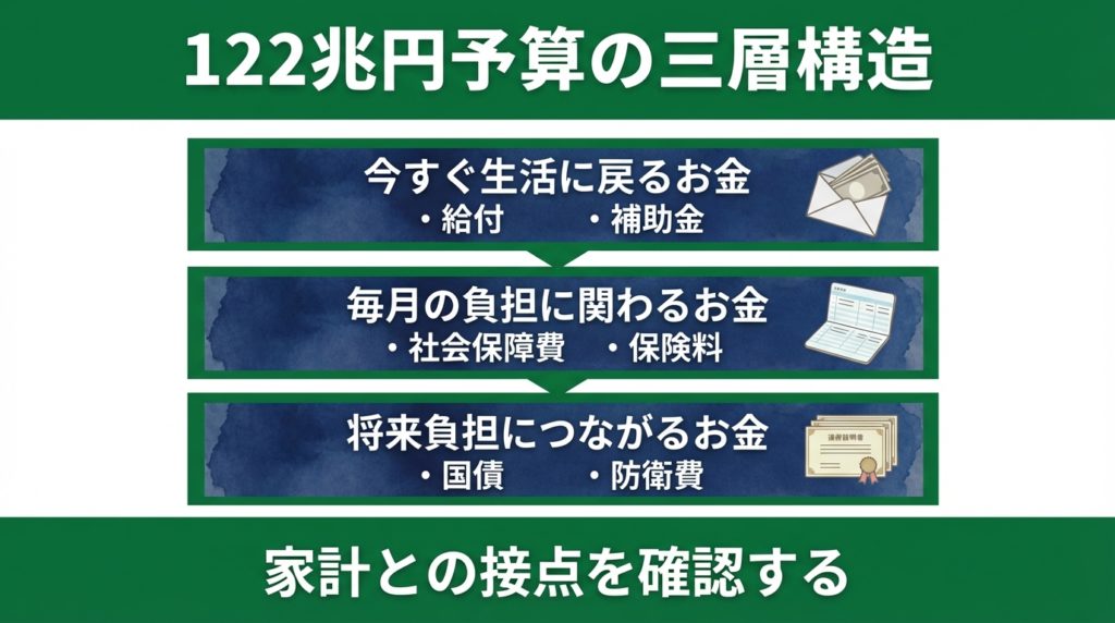 この三層で見ると、122兆円は「全部が家計直撃」でも「全部が他人事」でもありません。どの層に自分が接点を持つかが重要です。