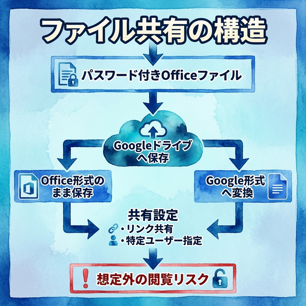 Officeファイルのパスワードは、あくまでファイル単体の保護機能です。一方でGoogleドライブの共有設定は、クラウド上でのアクセス制御です。この2つは連動しているわけではありません。