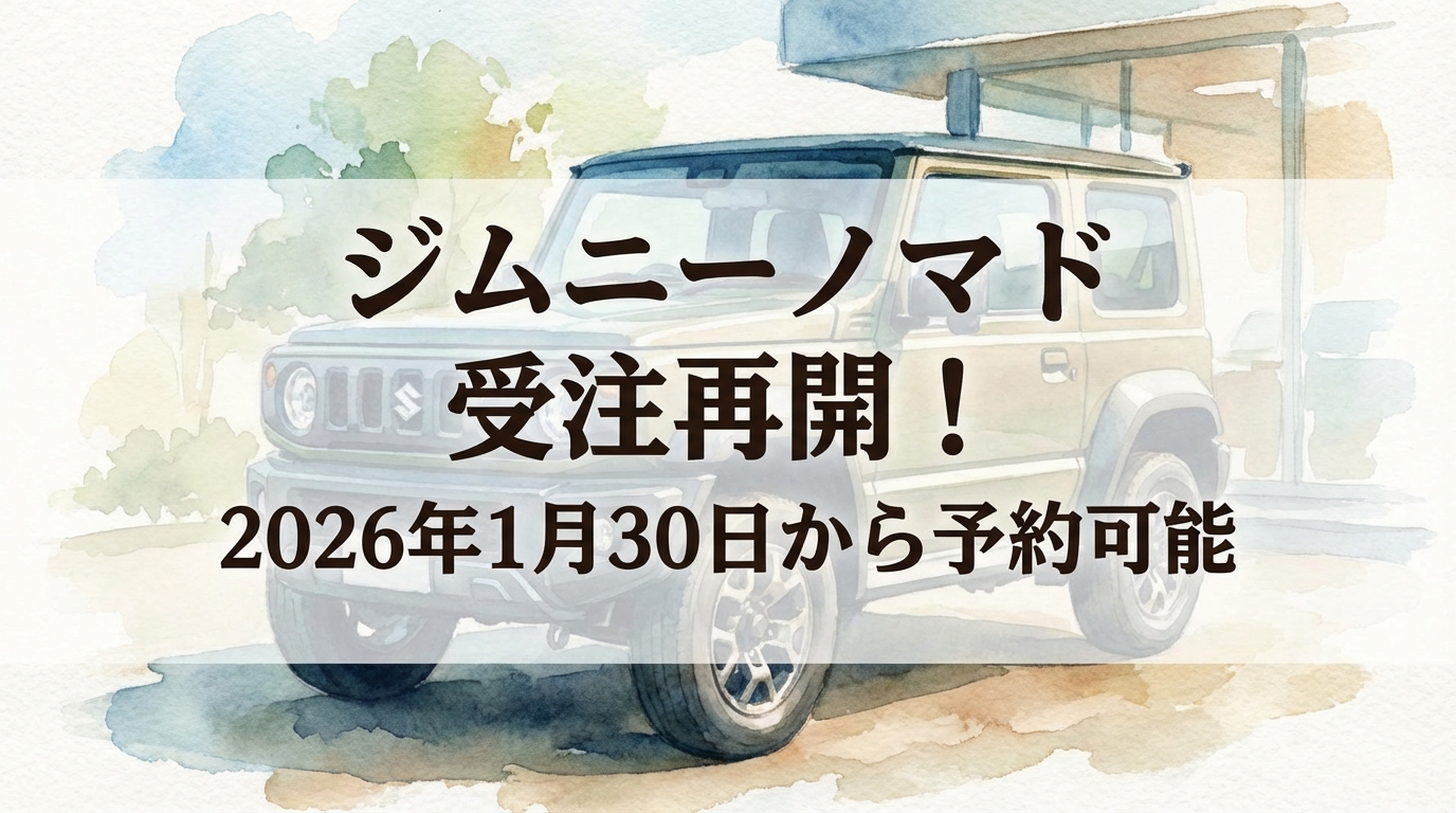スズキの人気SUV「ジムニーノマド」が、長らく停止していた受注受付を2026年1月30日から再開すると公式発表されました。2025年春の発売直後に注文が殺到し、わずか数日で受注停止になった話題のモデルだけに、購入検討者や納期を気にしていた人も多いはずです。再開の決定は“次のチャンス”として注目されていますが、実際にいつから申し込めるのか、どんな点に注意すべきなのかを整理しておきましょう。この記事では、受注再開の事実と流れ、そして予約前に確認したいポイントをわかりやすくまとめます。