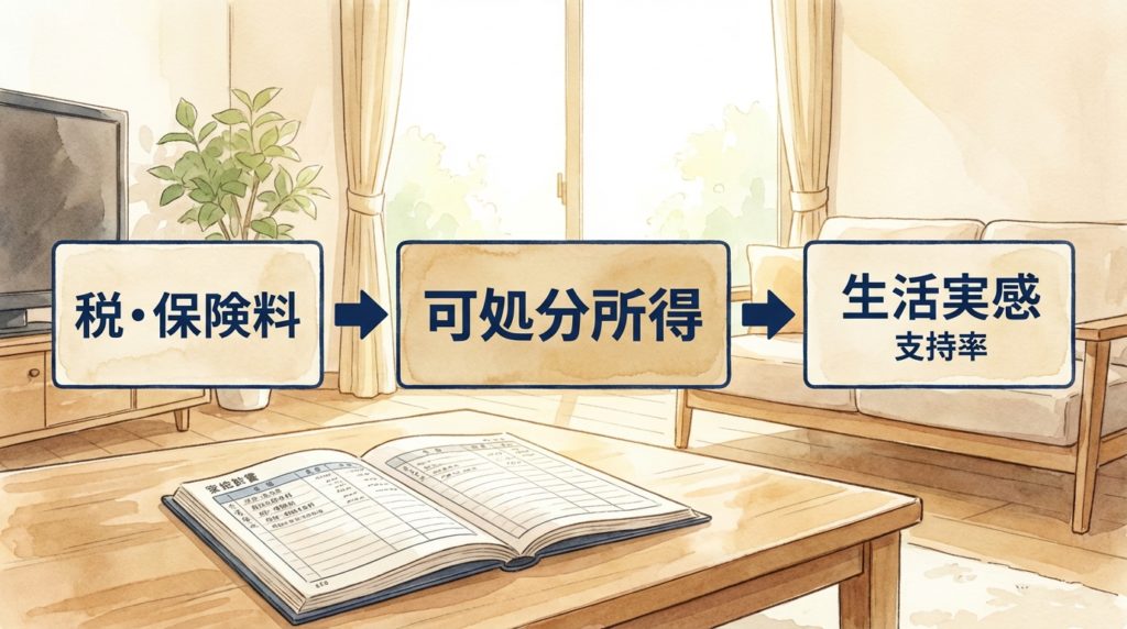 政治評価を冷静に見るためには、単発のニュースではなく、可処分所得の流れ全体を確認することが重要です。点ではなく線で見る視点が、支持率の背景理解につながります。